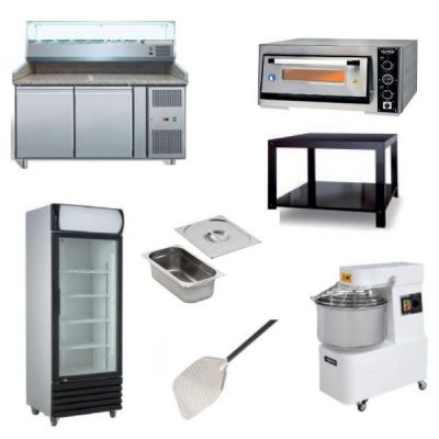 Pack Démarrage pour pizzeria contenant : Four à pizza ENTRY 4 pizzas Support pour four à pizza ENTRY Meuble à pizza 2 portes avec vitrine prof.800 Pétrin à spirale tête et cuve fixe de capacité 22 L Pelle à pizza avec manche en bois Kit bacs gastro 1m50
