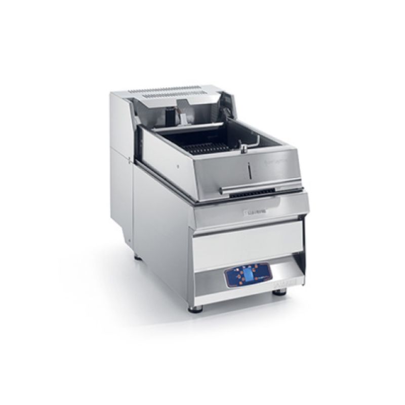 Acier inoxydable AISI 304 Scoth Brite GE 509EL : remplissage en eau manuel - tiroir extractible par-devant. Bac collecteur de graisses extractible depuis la surface de cuisson. Top : modèle de comptoir. Automatic : ouverture automatique de la surface de cuisson supérieure en fin de cuisson