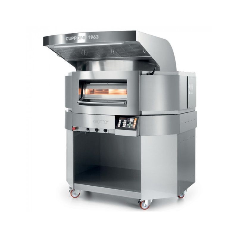 Four pizza électrique à sole tournante, puissance 17700 W. GT140/1TS Giotto Cuppone. Four électrique à sole tournante de diamètre Ø 1400 mm : simplicité d’utilisation et haute productivité. Maintien de la température avec n’importe quelle charge de travail. Garantie d’une cuisson parfaite de la première à la dernière pizza. Économique à l'usage. Support sur roulettes inclus. Hotte sur le dessus voir en option sur cette page.