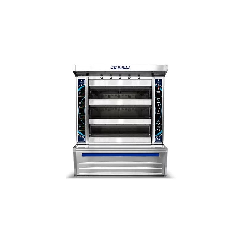Idéal pour la boulangerie et la pâtisserie - Dimensions ext : 1590 x 1130 x 1665 mm - Dimensions int: 3x 1260 x 825 x 300 mm - Capacité: 3x 4 plaques 400 x 600 mm (16/h) - Température maximale : 350°C - Puissance : 12Kw - Tension : 400V 50Hz ~ 3N - Poids net : 993 kg - Armoire réchauffée et hotte en option
