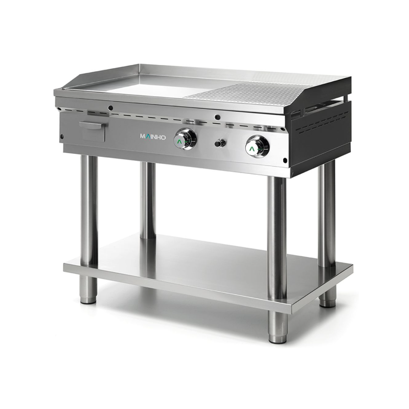 Le châssis STP MAINHO entièrement Inoxydable, supporte un plateau renforcé sur lequel les matériels MAINHO de la gamme Fry-tops PC et FC ainsi que les Grills PB - PBI - PBV peuvent être fixés.