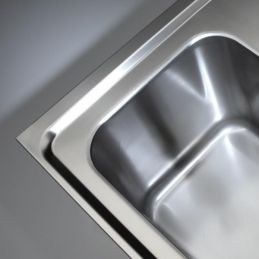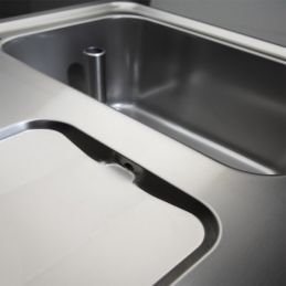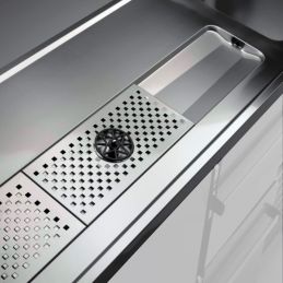 Top en acier inoxydable AISI 304 avec évasement périphérique, égouttoir avec grille et rince-verres, cuve(s) soudée(s) avec bonde de trop plein.
