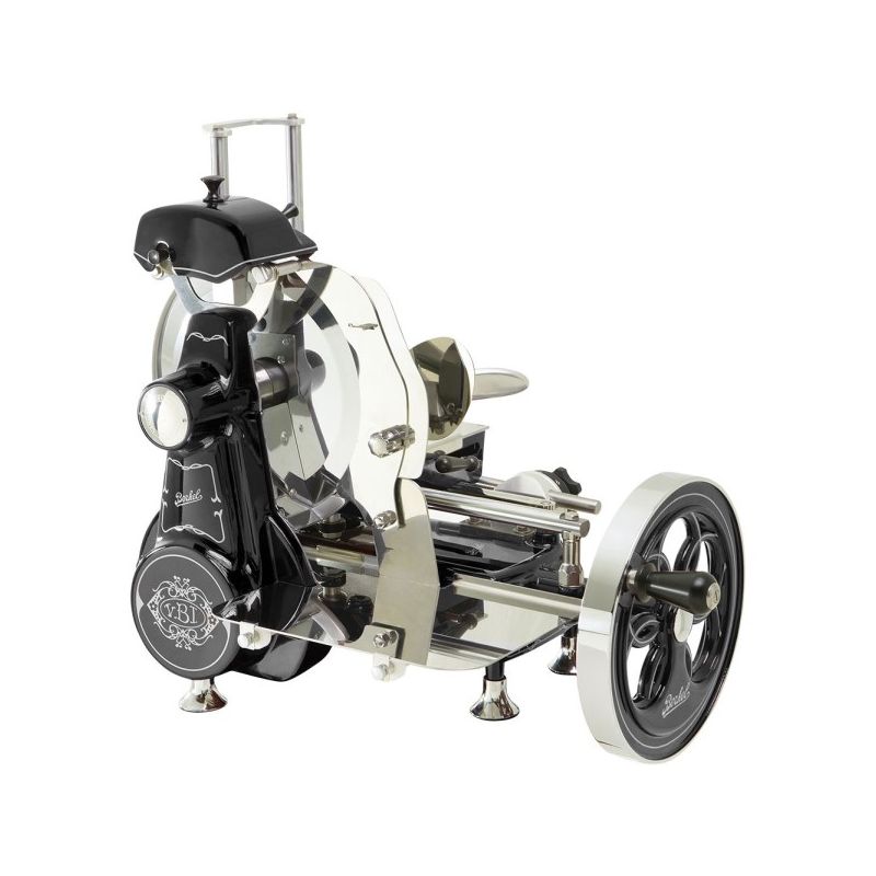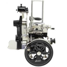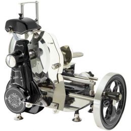 Une trancheuse à volant domestique ayant une grande capacité de coupe ainsi qu'une esthétique qui s'inspire des modèles d'époque.
